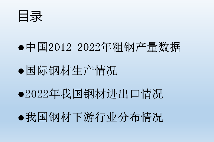 •我國現(xiàn)階段已經(jīng)初步實現(xiàn)城鎮(zhèn)化的建設(shè),隨著房地產(chǎn)需求的下滑,我們普通鋼材很難有一個大的增量,但是我國的特殊鋼材還有很大的發(fā)展空間。結(jié)合國家鋼材發(fā)展現(xiàn)狀,我們也慢慢的理解公司制定“高端、國有、人無我有”政策的現(xiàn)實依據(jù),希望大家能出通過了解行業(yè)發(fā)展的方向,明確目標(biāo),開發(fā)客戶,更好的規(guī)劃自己的銷售,取得好的業(yè)績。