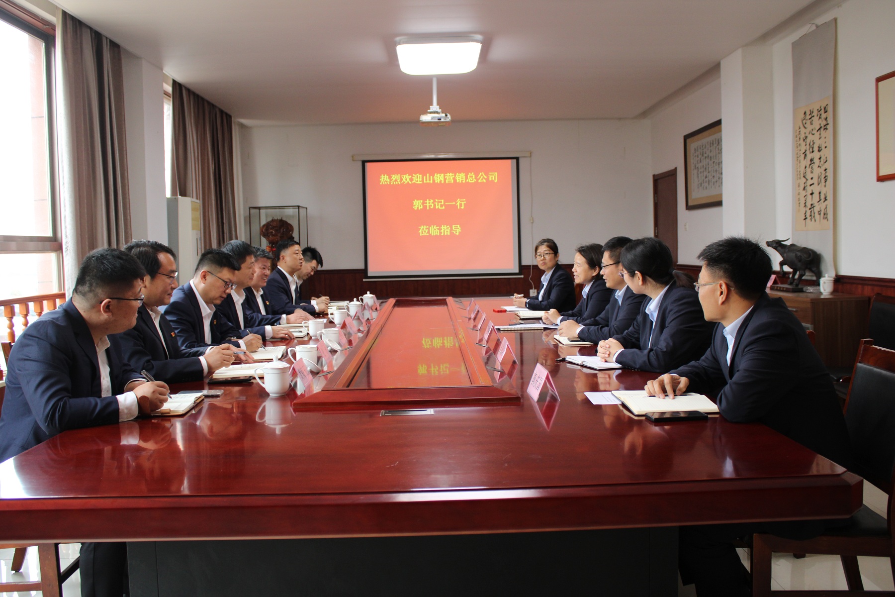 2023年11月3日,山鋼股份營(yíng)銷總公司郭書(shū)記一行到信橋考察調(diào)研,信橋公司董事長(zhǎng)徐立波、總經(jīng)理徐宏、副總及鋼廠聯(lián)絡(luò)員熱情接待。